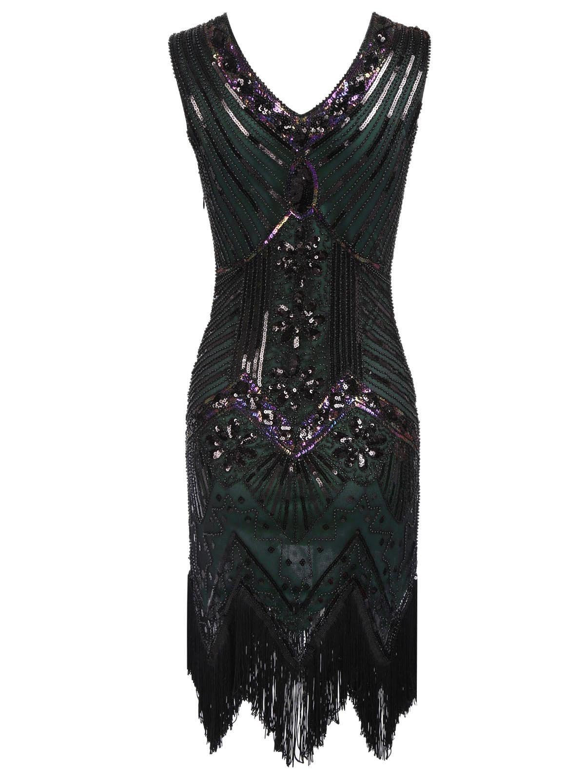 Shimmy some sparkle into your life, dear! A breathtaking vintage-inspired dress. A dazzling array of Champagne sequins cascade down to a tiered fringe scalloped hemline. Outfitted with a side zipper for an easy match with your favorite torch song! Prepare for flapper fabulousness!